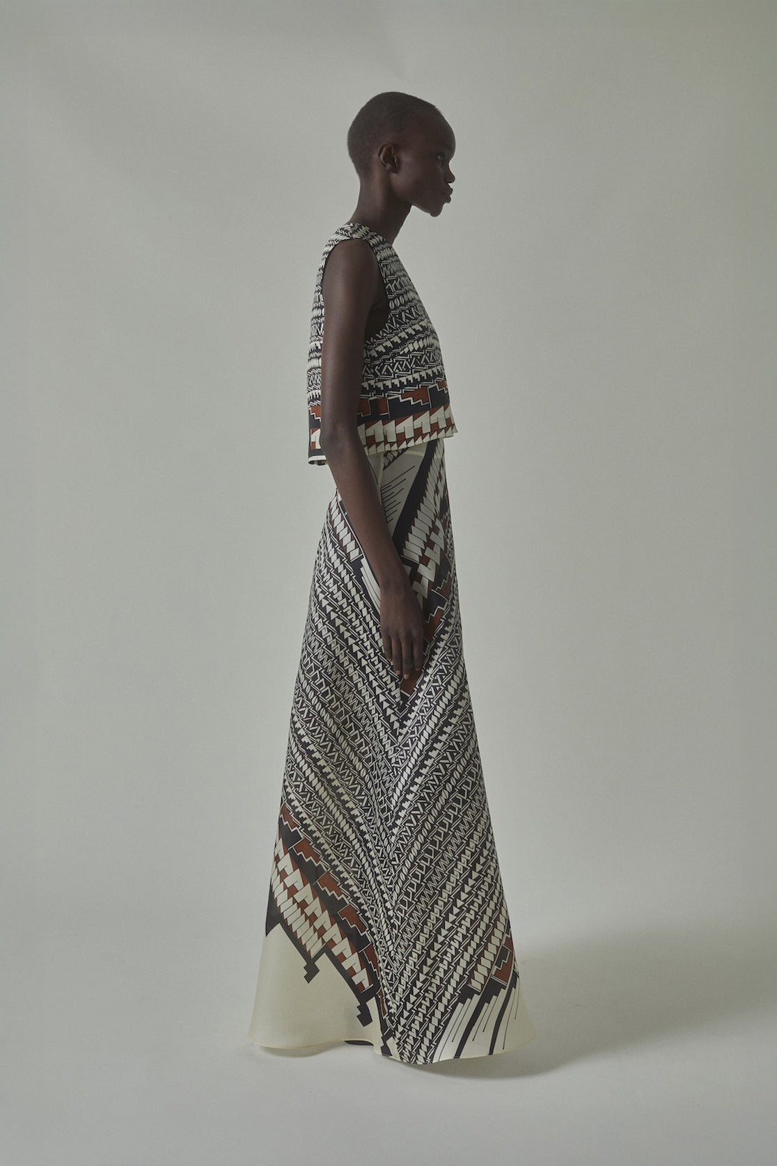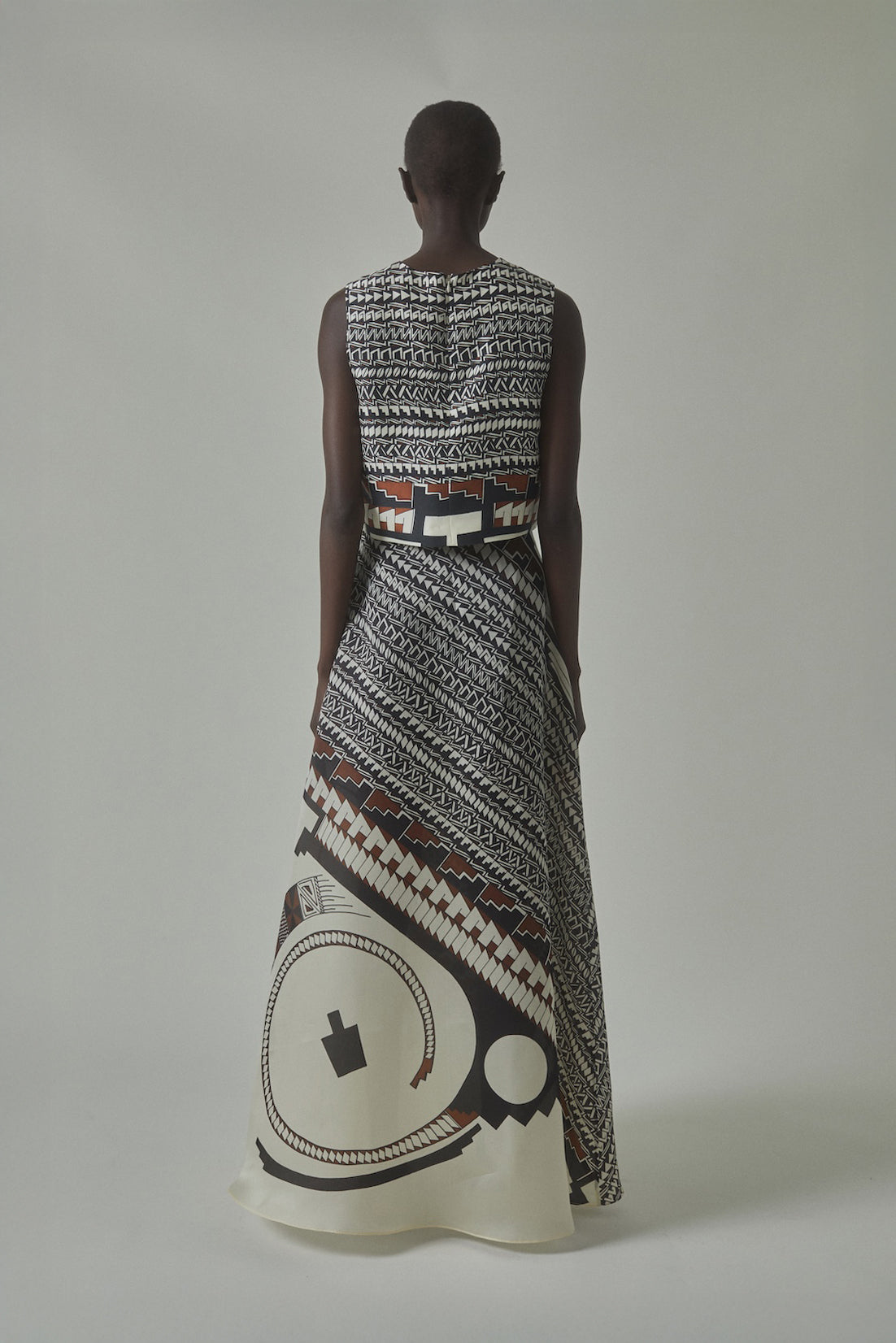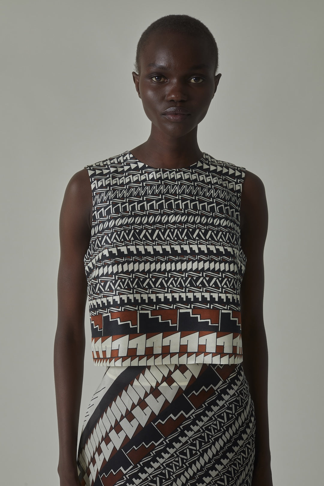 Cropped top in silk shantung with original artwork by Alex Jurado. Alex is an artisan from Mata Ortiz and his work is distinctly rooted in the cultural heritage of the Paquimé people of Chihuahua, México. Finished with a classic crew neckline, a center-back invisible zipper for closure and fully lined in silk.