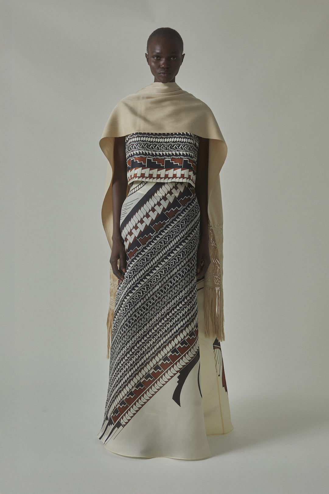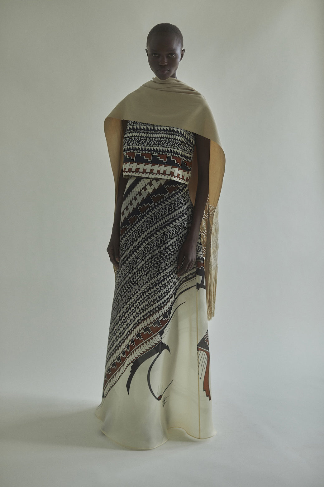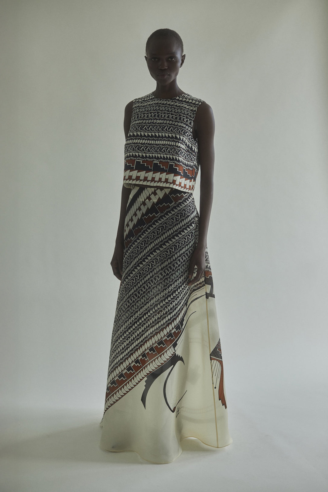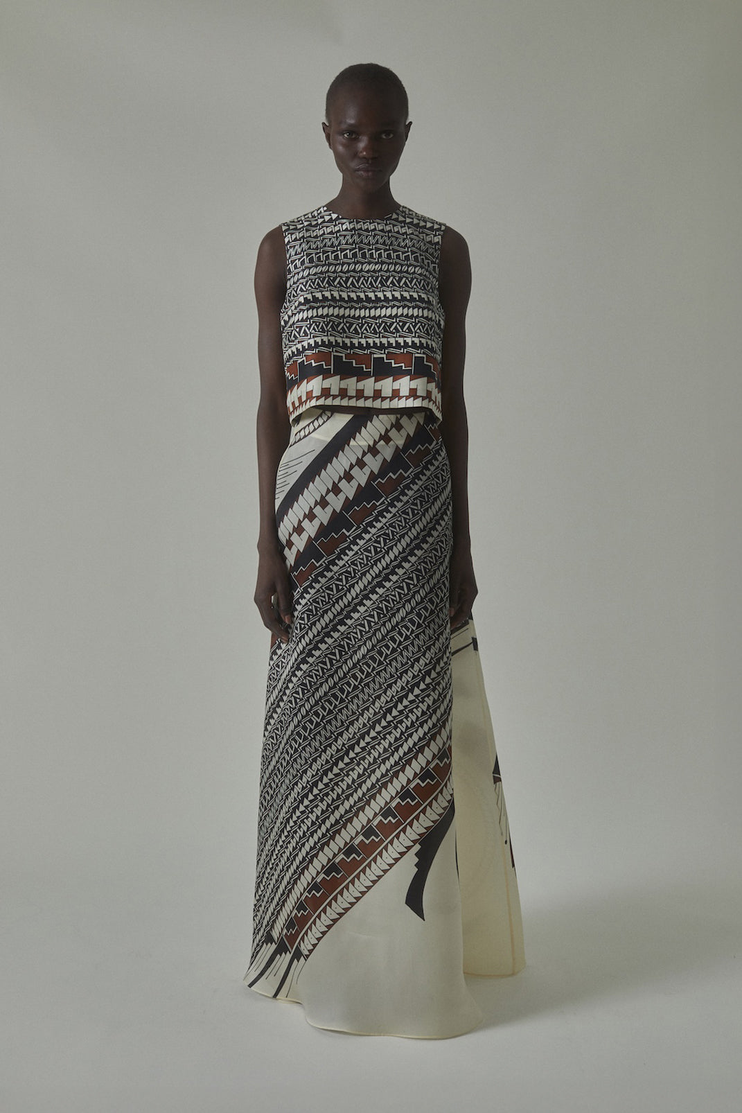 Cropped top in silk shantung with original artwork by Alex Jurado. Alex is an artisan from Mata Ortiz and his work is distinctly rooted in the cultural heritage of the Paquimé people of Chihuahua, México. Finished with a classic crew neckline, a center-back invisible zipper for closure and fully lined in silk.