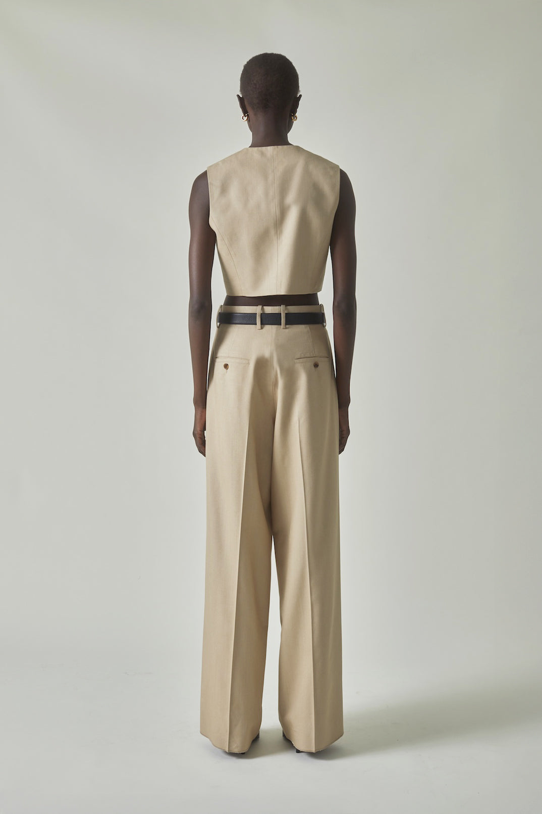 High-waisted, tapered leg trousers in Italian silk tussah fabric. Details include front pin tucks, interior waistband curtain, belt loops, side pockets and back pockets with fabric covered buttons.