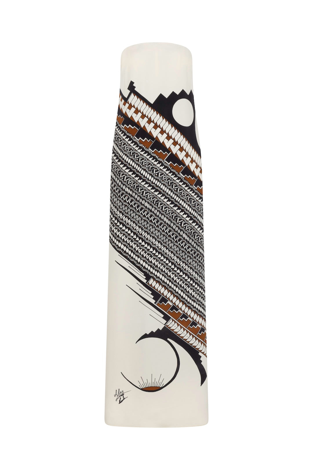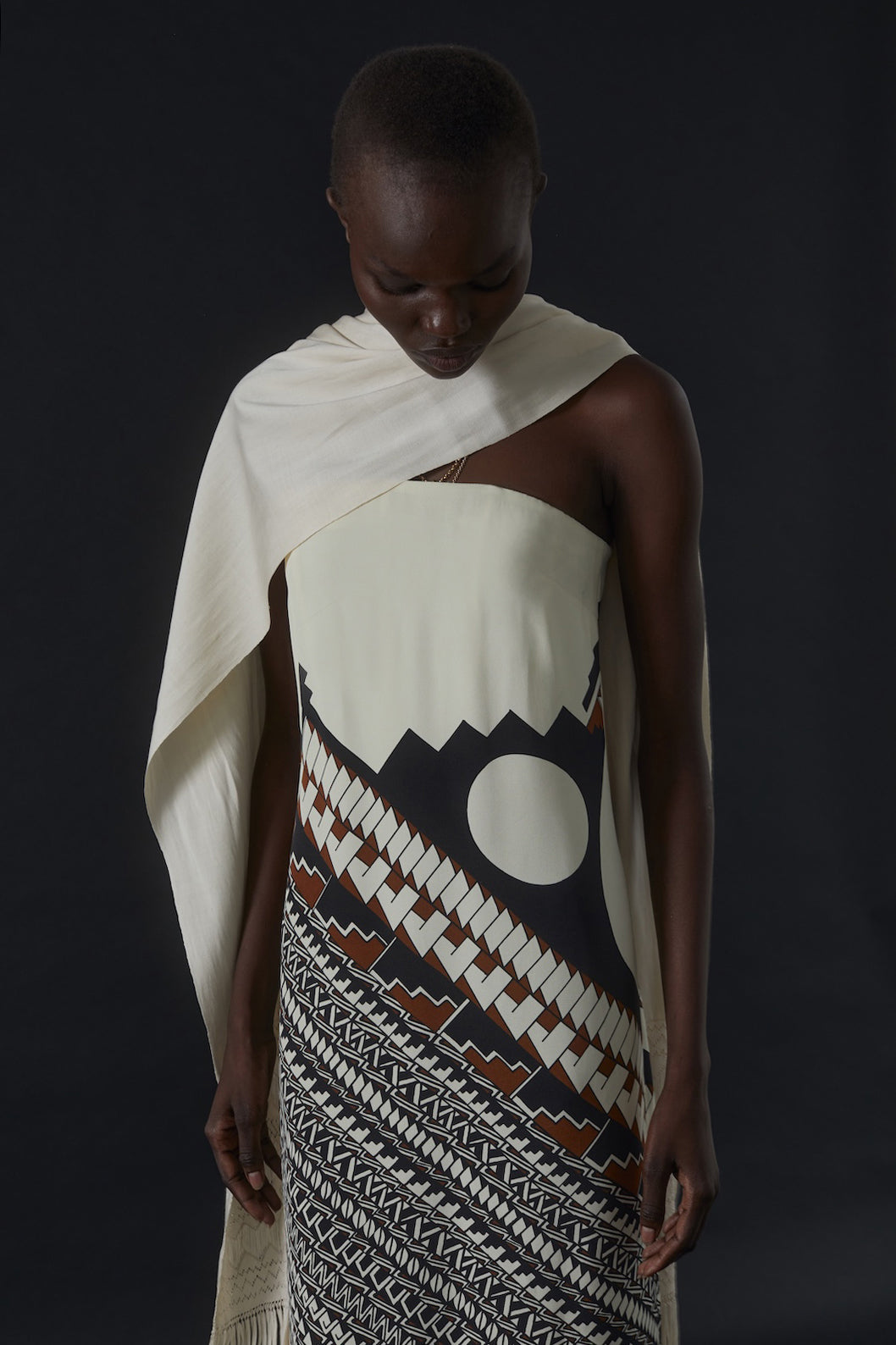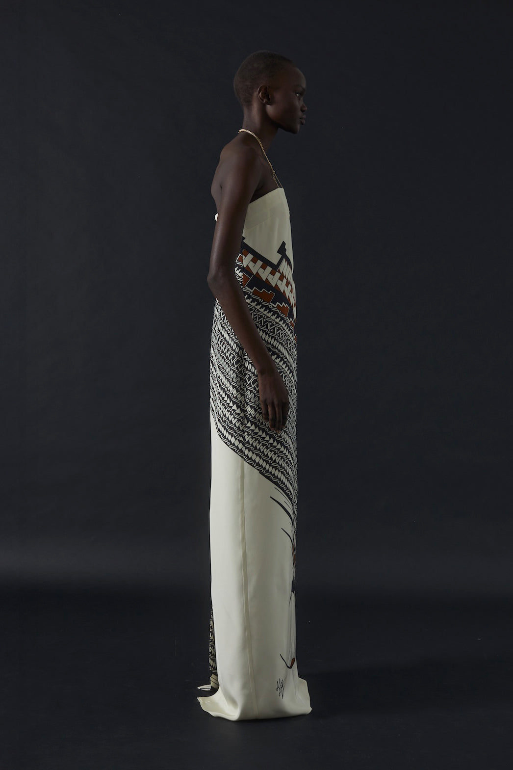 Silk crepe floor-length strapless dress with original placement print artwork by Mexican artisan Alex Jurado. Details include interior stretch corset with boning and elasticated waistband for comfort, and pocket at side seams. Artist's signature on dress.