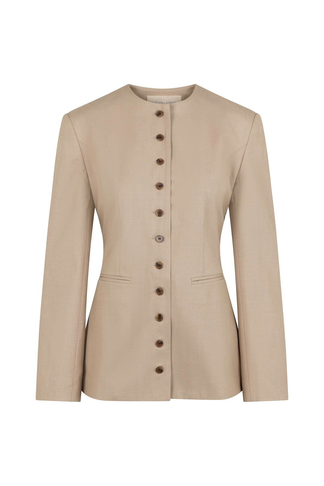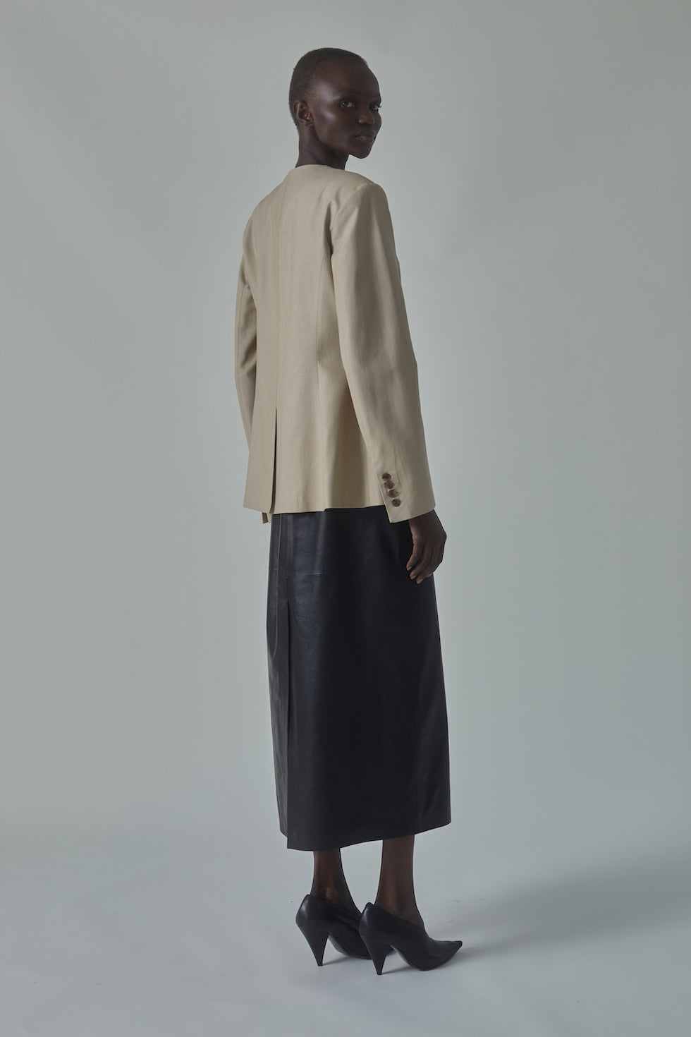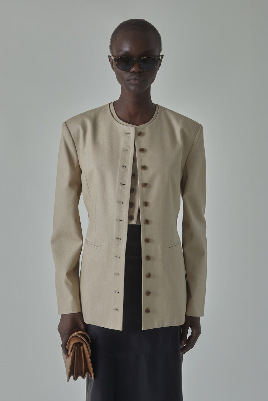 Crew neck, button-down blazer in Italian silk tussah fabric. Classic fit with light weight shoulder pads, and subtle hourglass silhouette. Other details include buttons down front for closure, buttons at sleeves and besom pockets. Versatile styling options, can be worn both as a blazer or a top.
