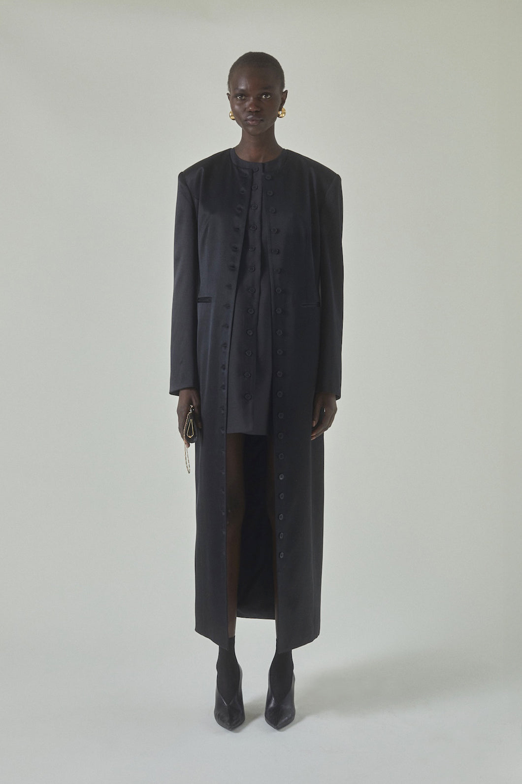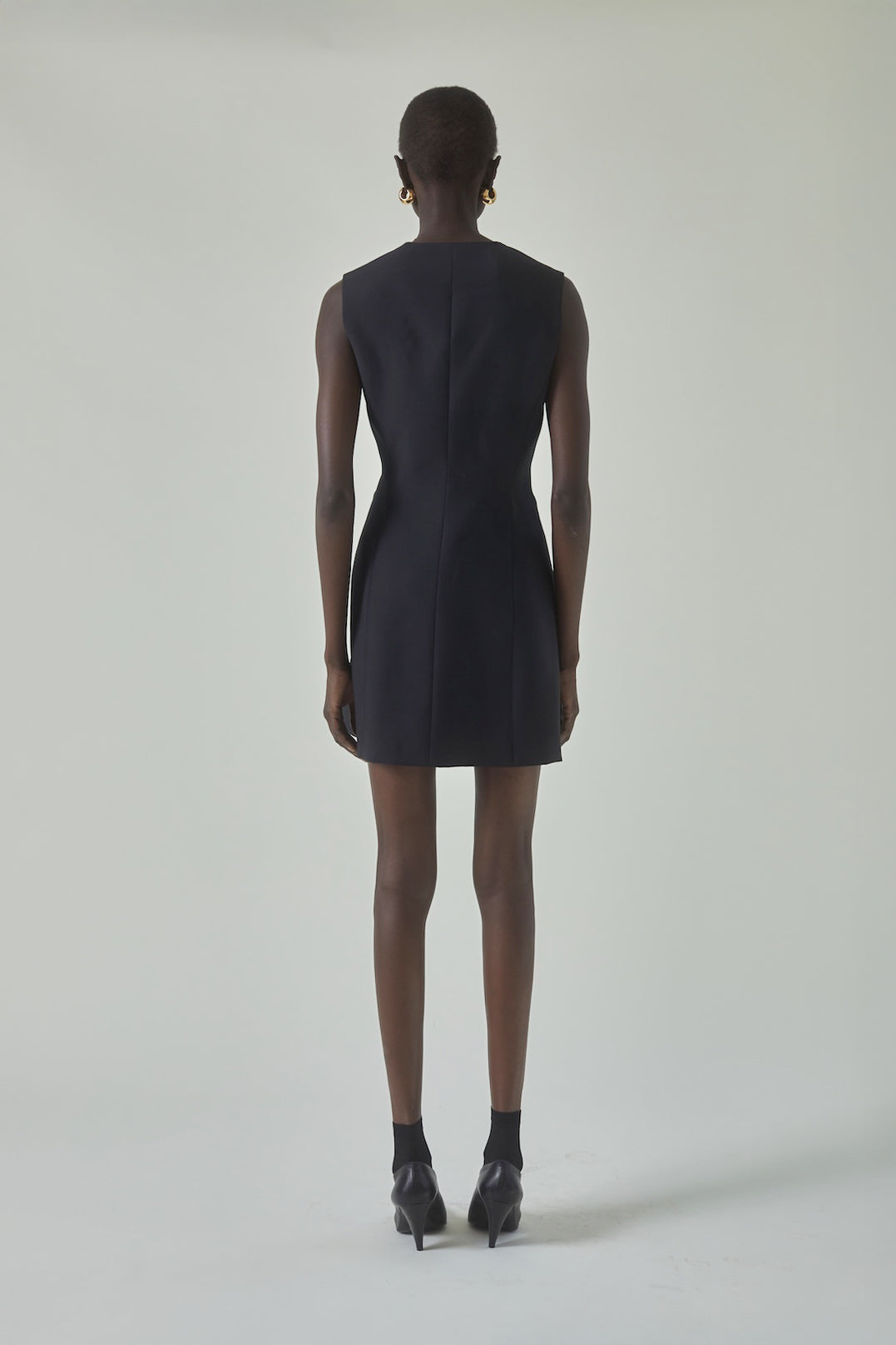 Tailored mini dress in silk and wool fabric. Slim fitting through body with front buttons for closure that allow versatile styling options. Designed to be worn as a dress or a long vest with trousers. Other details include crew neckline and besom pockets.