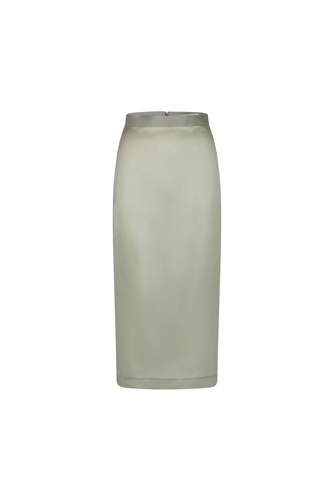 Opaque-sheer midi pencil skirt crafted from satin-faced silk organza. This versatile piece features a wide waistband with internal grosgrain for structure, a back vent for ease of movement, and an invisible zipper for closure. The garment is meticulously finished with interior French seams and blind stitching at the waist and hem.