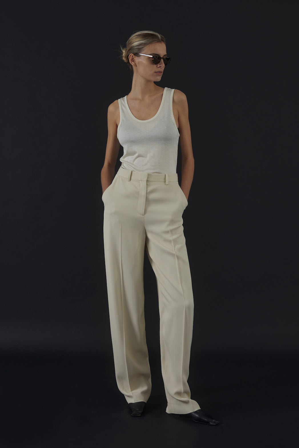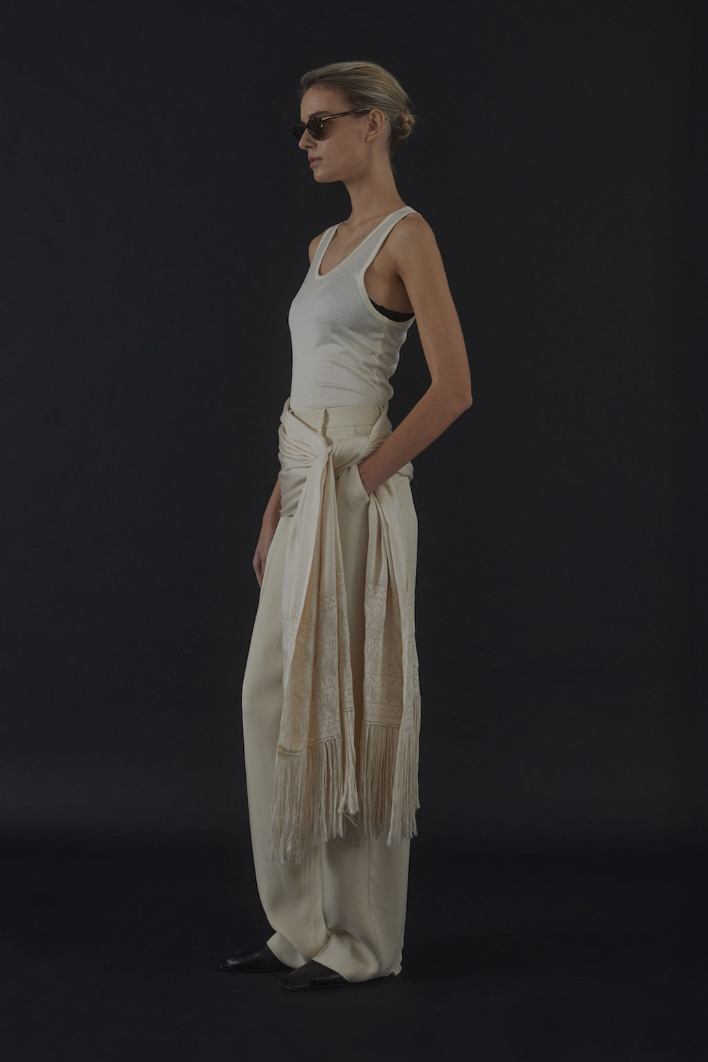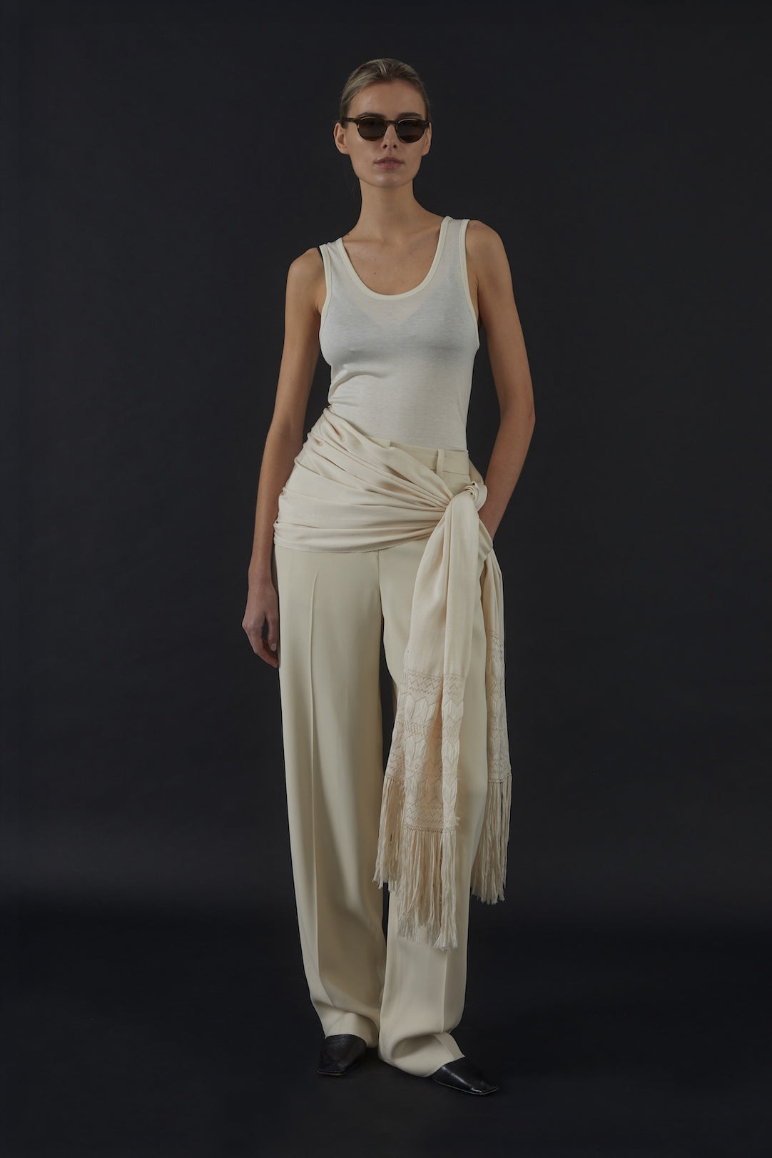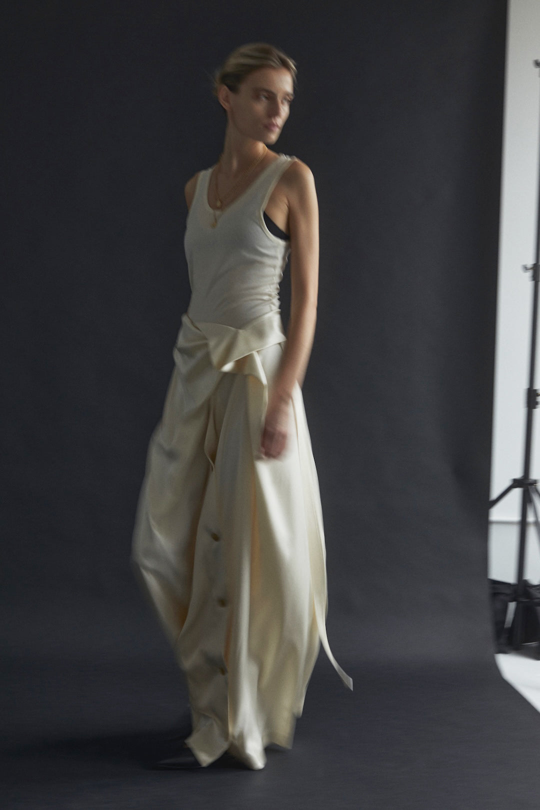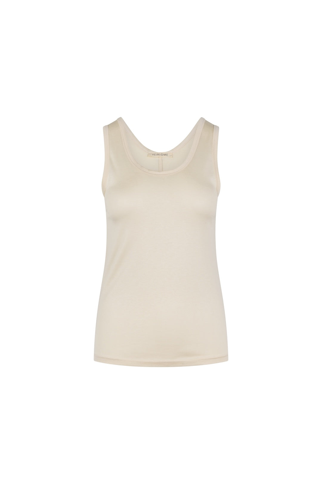 Tank top in lightweight recycled silk jersey. Scooped neck with self binding at neckline and armholes, finished with interior french seams.