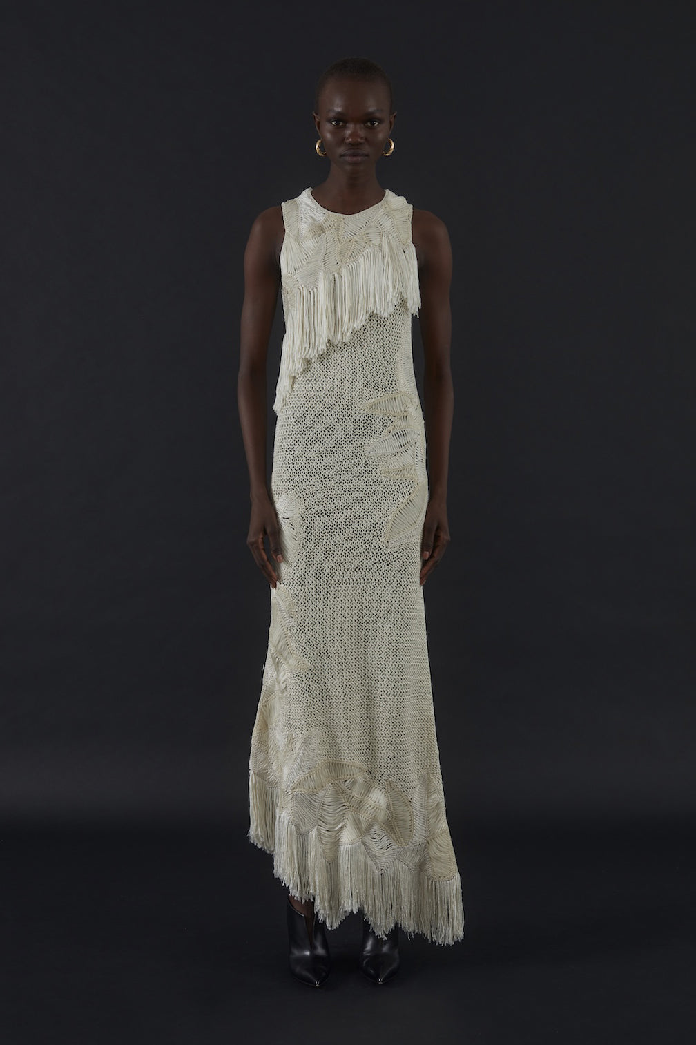 Macrame knit dress in a variety of Japanese and Italian silk yarns. Designed to be fitted through body, with fringe at bodice and asymmetrical with fringed hem. Intricate stitches are expertly hand crafted by artisans in Bolivia from the collective Madres y Artesanas Tex.