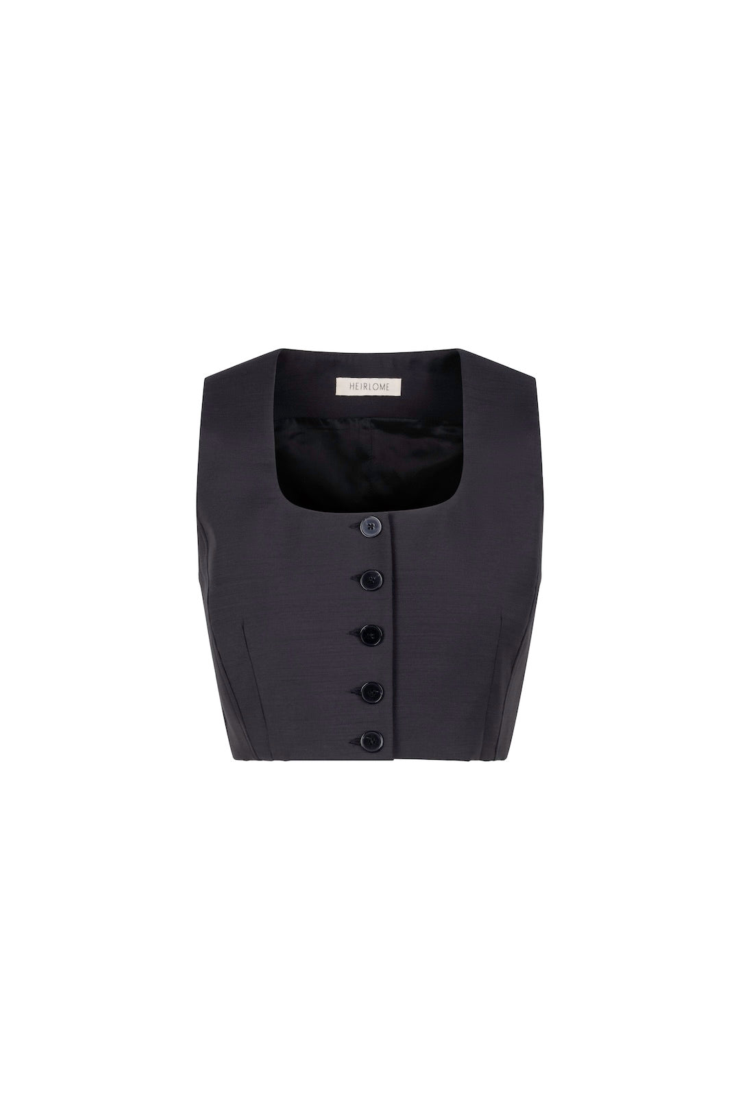 Tailored cropped top crafted from Italian silk and wool faille. It features a scooped neckline and a center-front button closure. Designed for effortless coordination, it is intended to be styled with Heirlome’s signature trousers and skirts. The garment is fully lined in Bemberg taffeta for a smooth, comfortable fit.