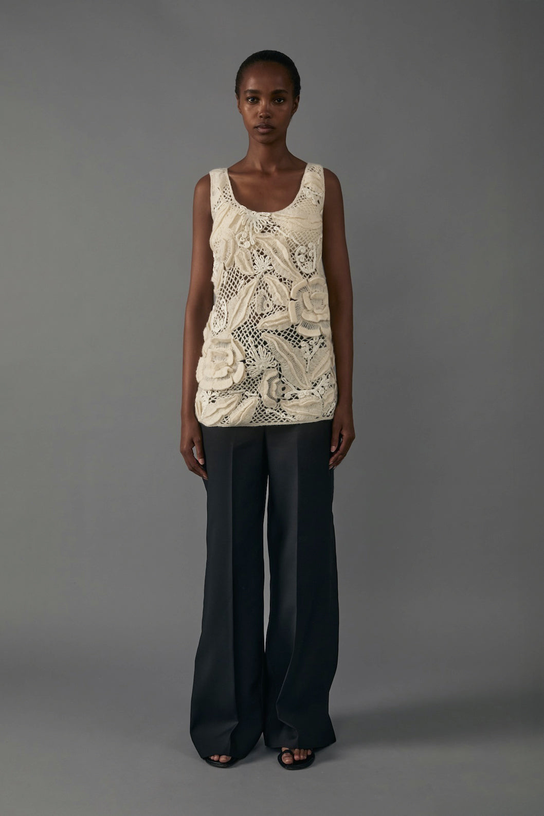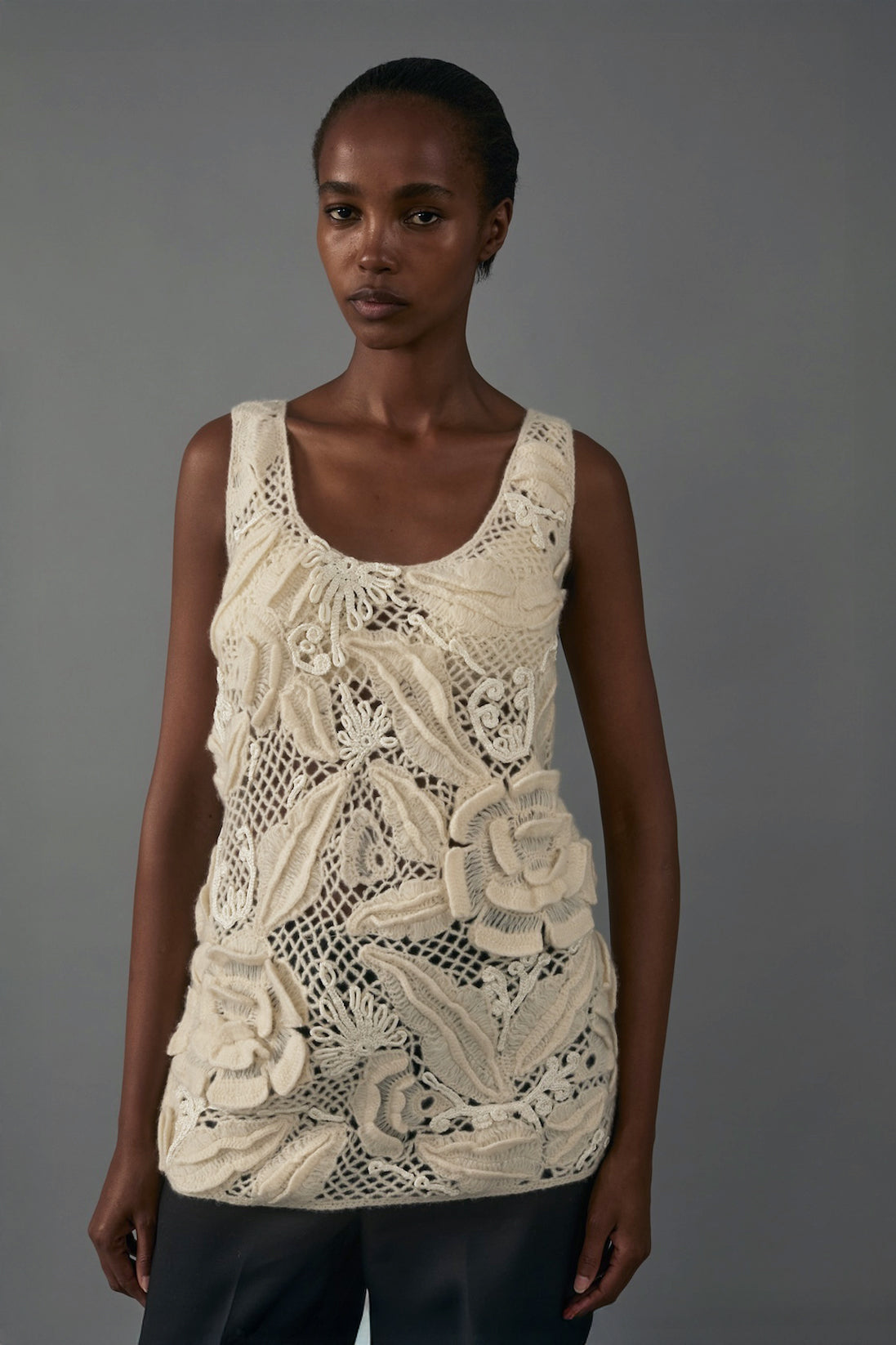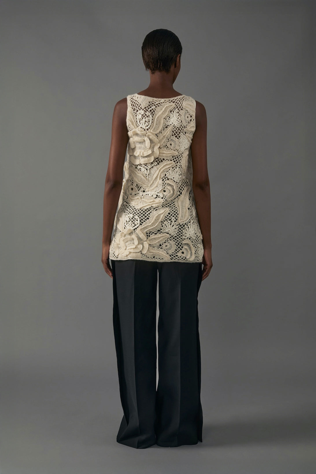 Cashmere and silk crochet top with intricate handwork inspired by the work of Mexican artisans Bernardina Rivera Baltazar and her daughter, Roselia Felipe Rivera. Hand-crafted in the finest Italian cashmere with hand sewn silk appliqué. Fit is straight through the body and has a low scooped neckline. Expertly handcrafted by artisans in Bolivia from the collective Madres y Artesanas Tex.