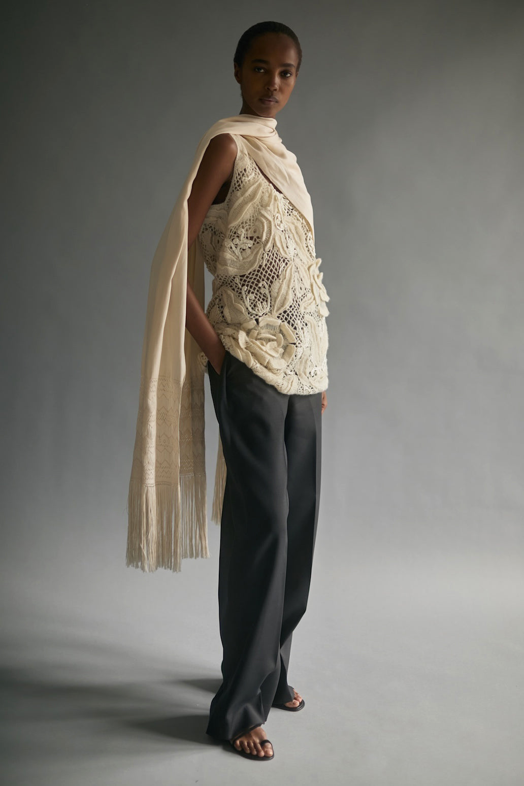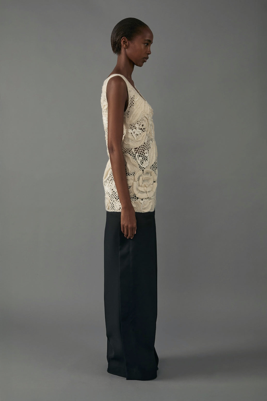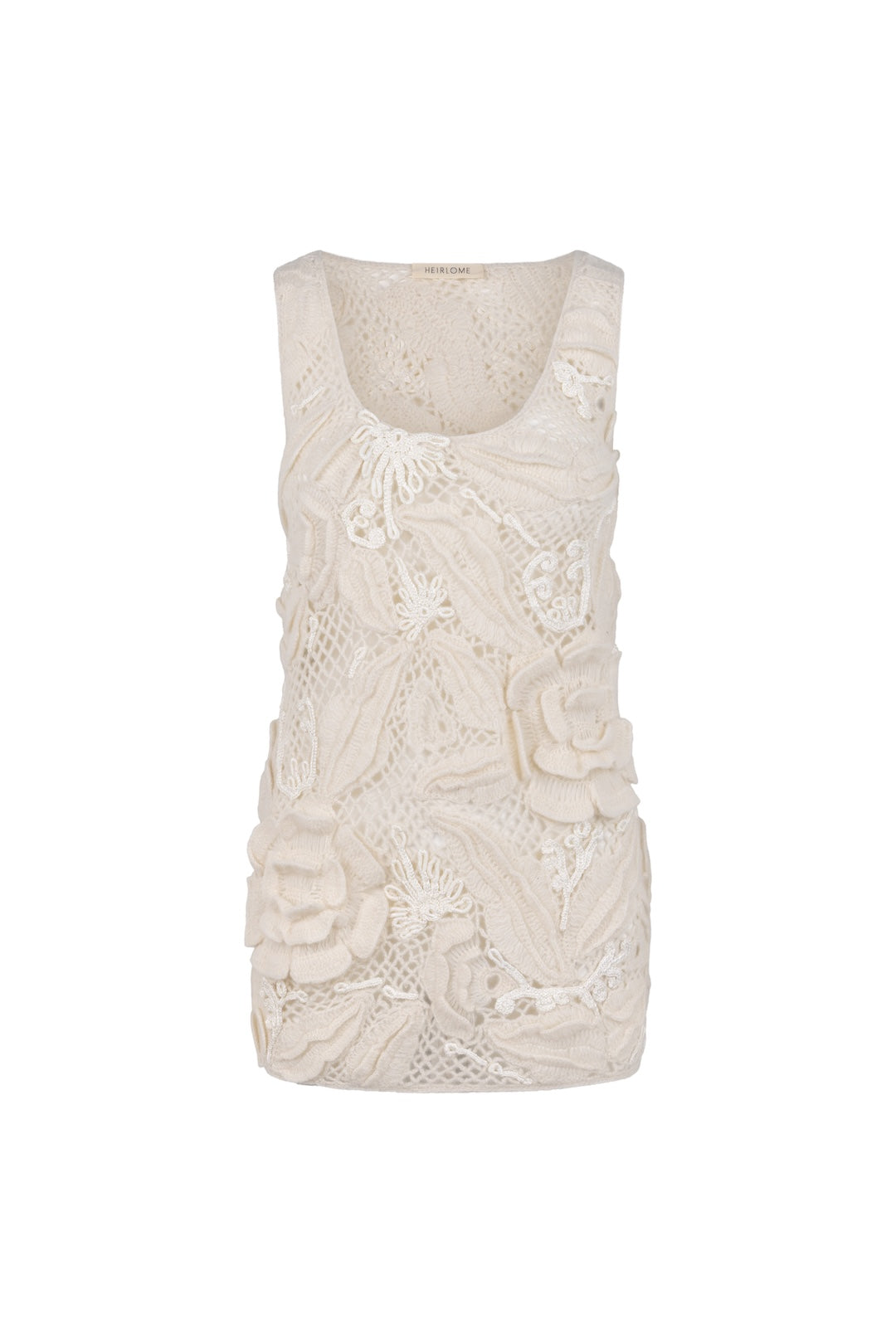 Cashmere and silk crochet top with intricate handwork inspired by the work of Mexican artisans Bernardina Rivera Baltazar and her daughter, Roselia Felipe Rivera. Hand-crafted in the finest Italian cashmere with hand sewn silk appliqué. Fit is straight through the body and has a low scooped neckline. Expertly handcrafted by artisans in Bolivia from the collective Madres y Artesanas Tex.