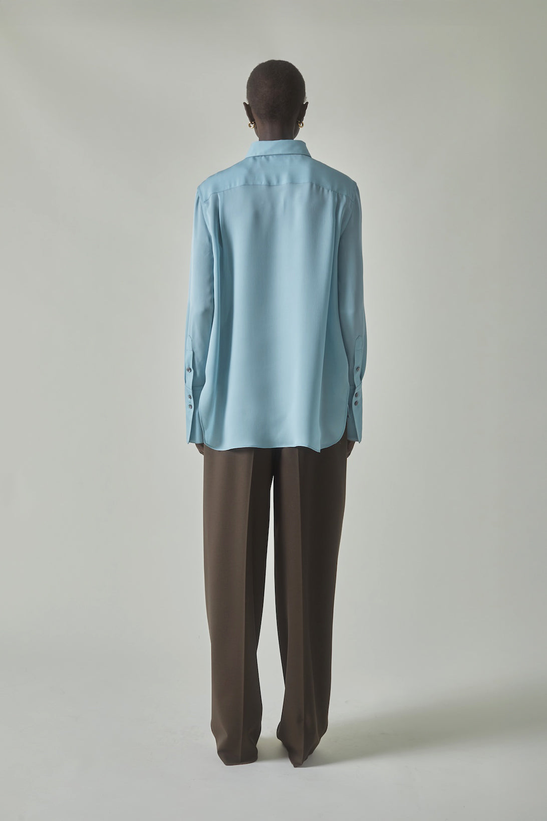 Button-down shirt in silk double georgette fabric. Slim fitting through body, with elongated shirt cuffs that may be folded for styling. Other details include exposed button placket and pin tucks at front panels.